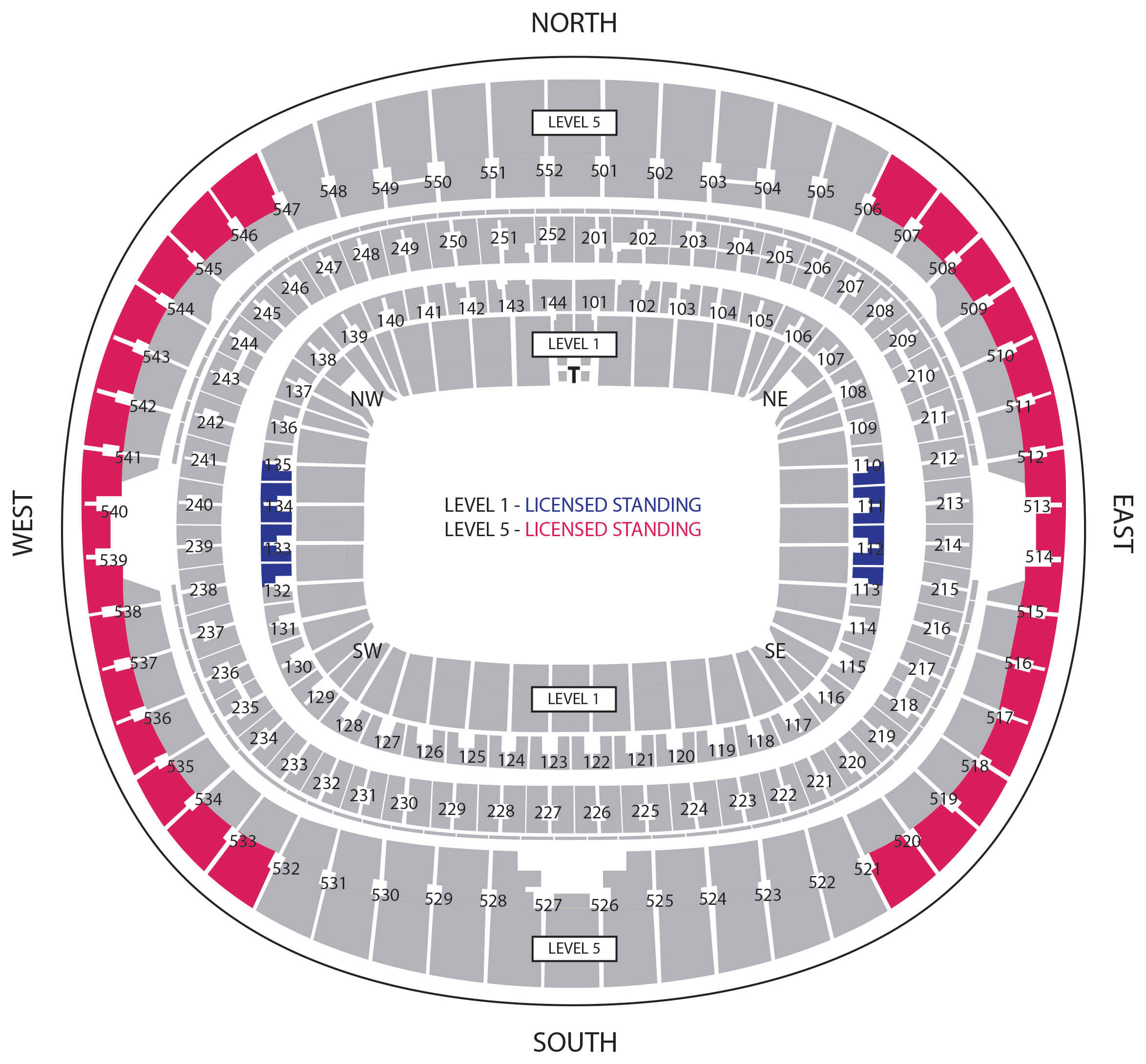Licensed standing areas for this event are located within specific blocks on Level 1 and Level 5. Please note that licensed standing applies only to specific rows within certain blocks, not entire blocks.